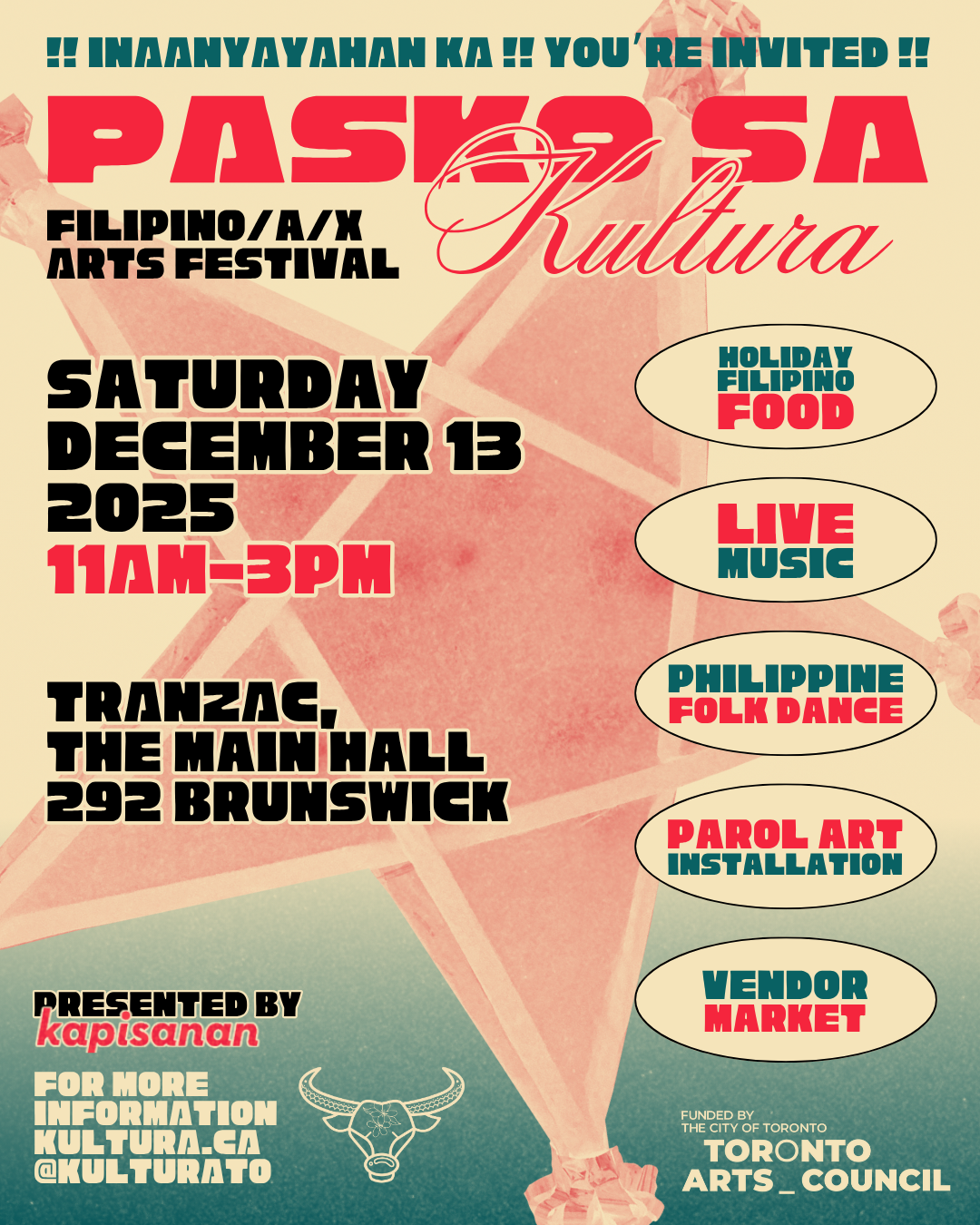Hosted by Kapisanan Philippine Centre for Arts & Culture. Pasko sa Kultura is a Filipino winter arts festival celebrating Filipino/a/x Canadian identity, arts and culture. Pasko sa Kultura marks this generation’s arts and culture movement, championing the Filipino/a/x community, forging new pathways for Filipino/a/x creatives to rise up in the Toronto scene.
